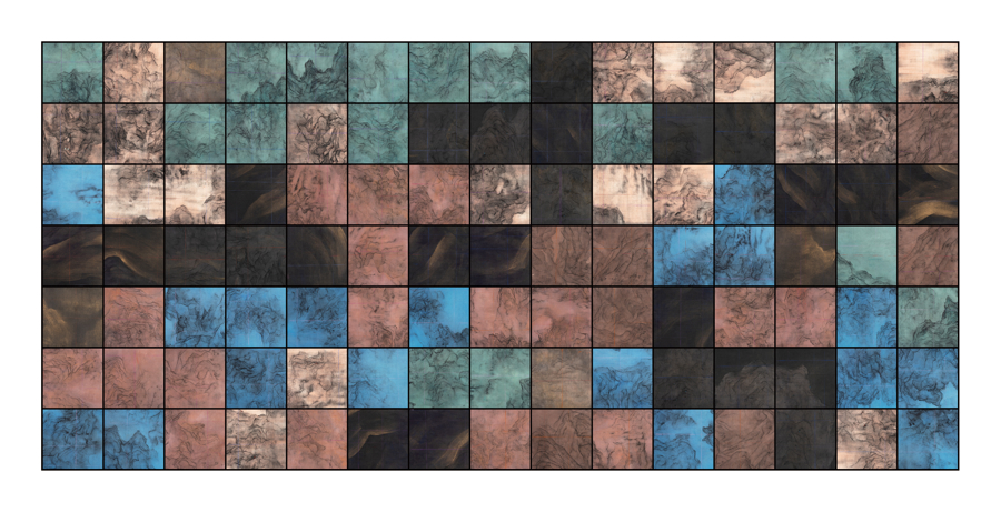 王绍强《淬厉新之》则是传统绘画当代转型的实践,由105件正方形水墨模块拼合而成,借鉴宋代山水画技法,并引入蒙德里安《网格构图9》的几何秩序,将传统丘壑、云雾转化为墨色块面,形成东方水墨与西方抽象的融合对话。