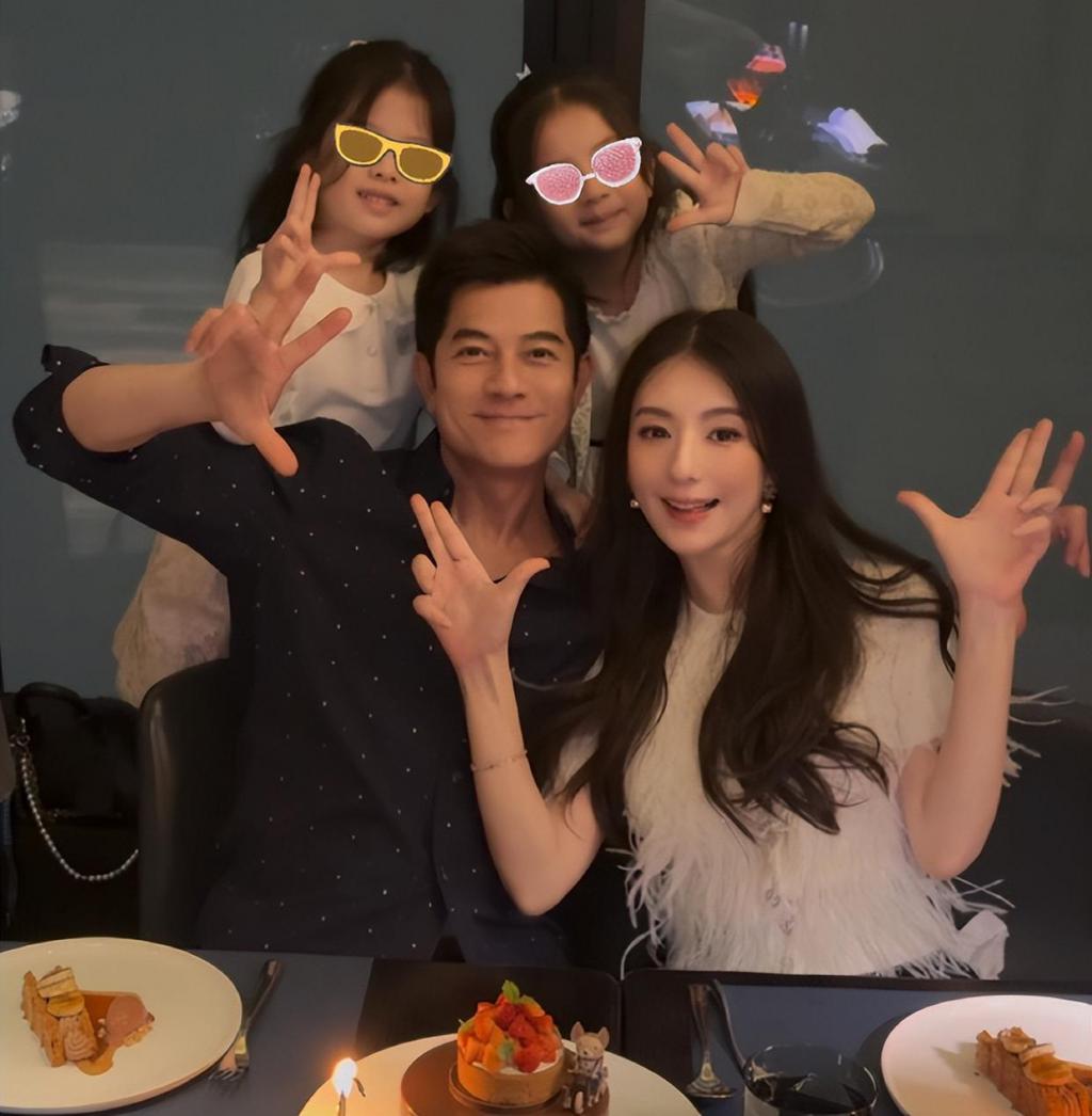 在郭富城晒出的照片中,郭富城和方媛比出手势甜蜜合影,两个女儿站在爸爸妈妈的背后摆出同样的动作,甚是乖巧。
