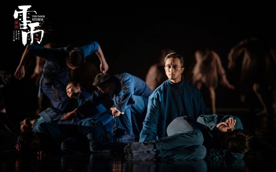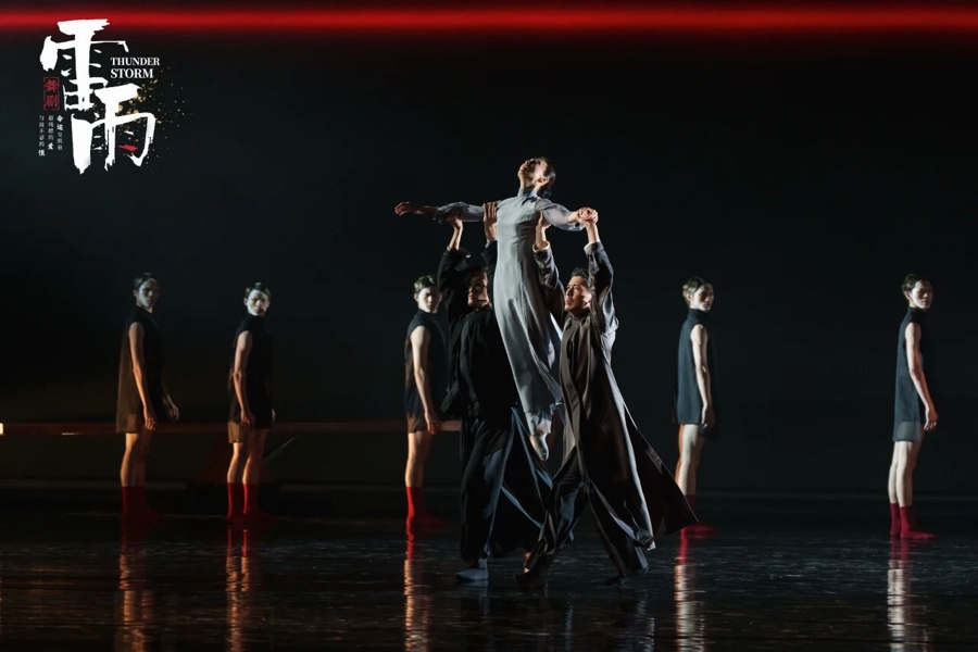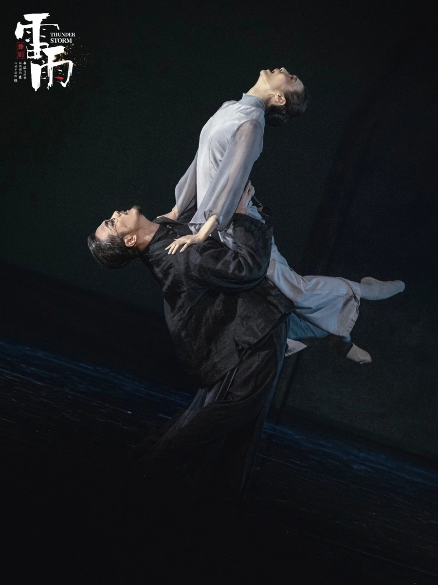 舞剧《雷雨》由一级编导赵小刚担任总编导,中国歌剧舞剧院艺术总监山翀担任艺术总监并特邀出演,用肢体集中言说了一个矛盾爆发的雷雨夜。全剧以“侍萍凝眸”开篇,通过《闹鬼》《喝药》《混战》《贵客》《春梦》等8场戏,串联起一场偶然与注定写就的宿命,既保留了原著里八个人物的爱恨纠葛,又通过现代视角,对原有文本予以重新构架。作品引入“侍萍视角”统摄全剧,通过首尾呼应的“命运回环”打破原著线性叙事逻辑,使舞段形成彼此嵌套、情绪递进的张力结构;同时采用“以舞带戏”推进叙事,从人物的动态形象到情节的舞蹈语汇构成,再到叙事的隐喻表达与情思的视觉呈现,让观众看到由舞蹈本身穿透文字所带来的心灵映现。