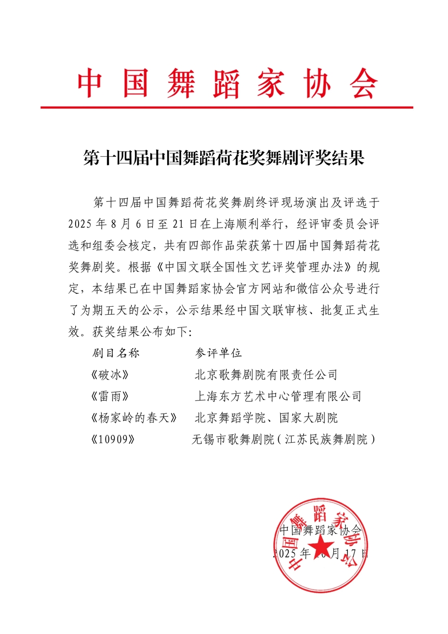 《破冰》《雷雨》《杨家岭的春天》《10909》四部作品荣获第十四届中国舞蹈“荷花奖”舞剧奖,10月18日,中国舞蹈家协会正式发布了这一国内舞蹈界最高奖评选结果。其中,由上海东方艺术中心管理有限公司总制作出品的舞剧《雷雨》既是代表上海参评的唯一作品,也是四部获奖舞剧中唯一由剧院主体第一制作出品的作品。