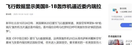美国媒体23日援引飞行数据报道,美国空军两架B-1B“枪骑兵”轰炸机当天逼近委内瑞拉。 一个小小的委内瑞拉现在正在被美国军事力量大举包围,事实上美国在委内瑞拉周边部署的军事力量也足够发起一次对委内瑞拉的全面武装进攻。